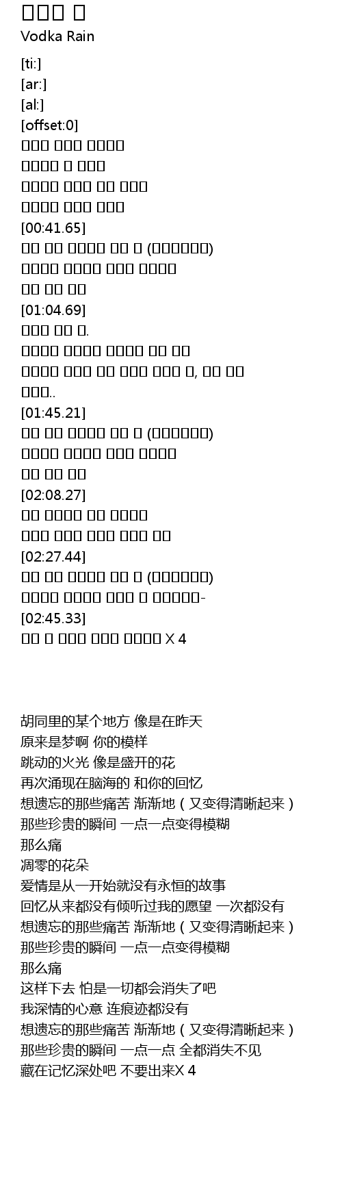 | [01:45.91] | 잊고 싶은 아픔들은 점점 더 (또렷해지지만) |