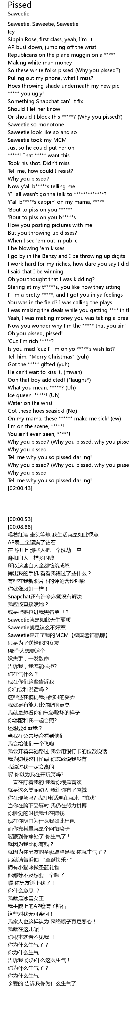 | [01:44.14] | Why you pissed? (Why you pissed, why you pissed?) |