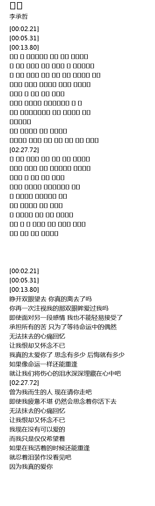 | [03:00.46] | 날 위해 태어난 사람 그댈 이젠 떠나줘요 |