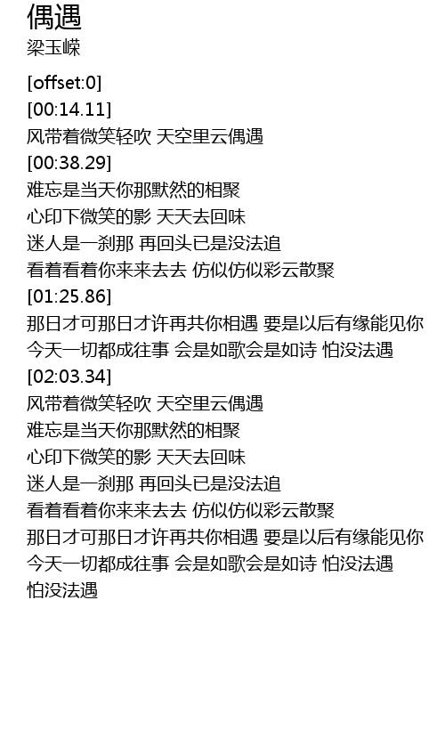 | [01:45.10] | 今天一切都成往事 会是如歌会是如诗 怕没法遇 |