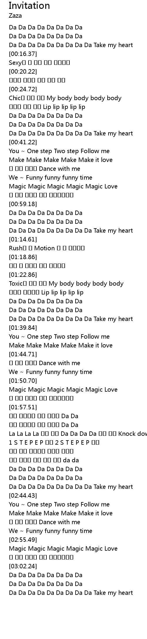 | [00:13.24] | Da Da Da Da Da Da Da Da Da Take my heart |