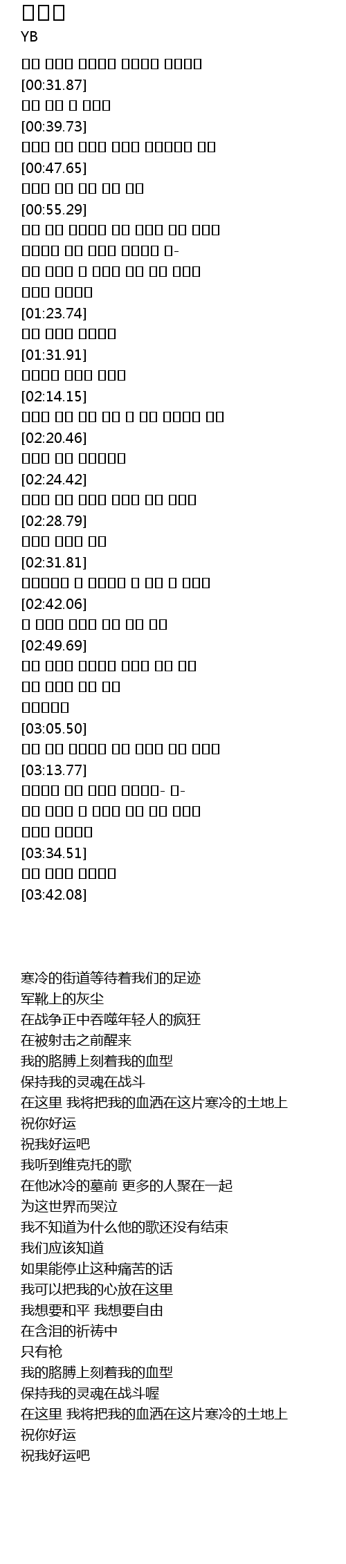 | [03:22.72] | 여기 싸늘한 이 땅에서 나의 피를 묻으리 |