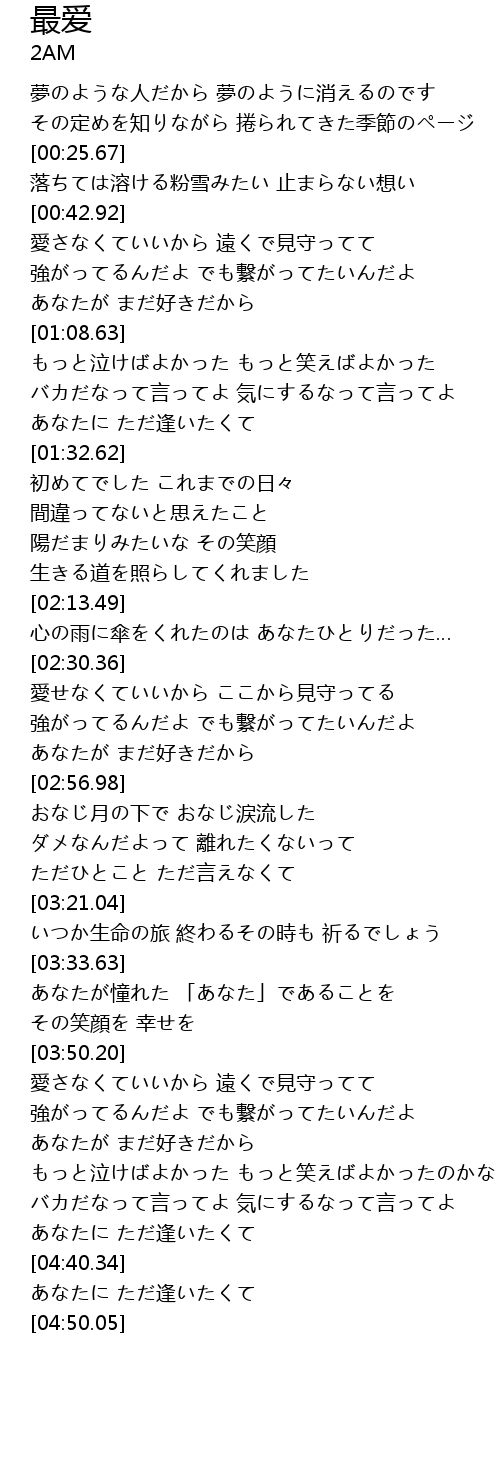 | [03:08.87] | ダメなんだよって 離れたくないって |
