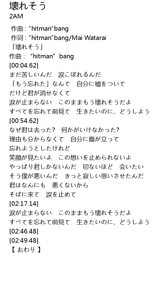 | [02:18.68] | 涙が止まらない このままもう壊れそうだよ |