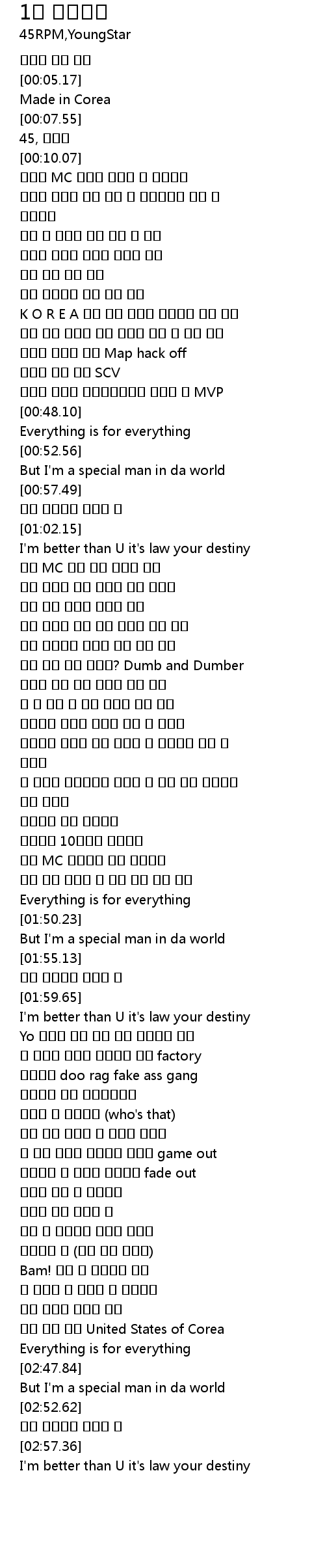 | [01:09.94] | 외모 뿐만이 아닌 랩까지 모두 똑같이 |