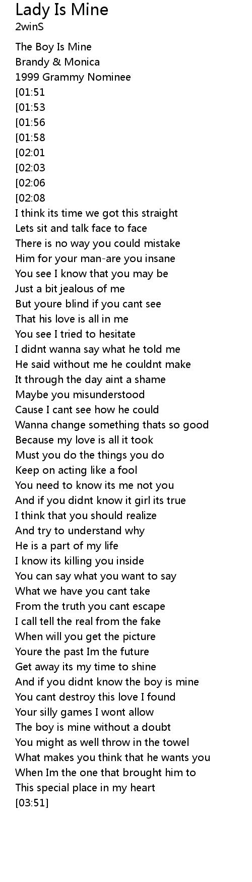 | [01:07][02:08][03:10][03:30][04:11][04:32][04:52] | The boy is mine |