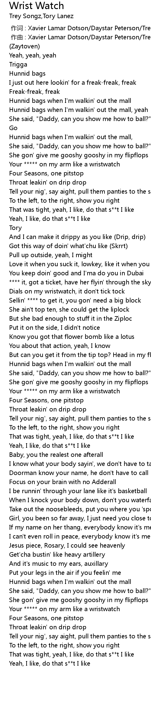 | [00:33.77] | Your ***** on my arm like a wristwatch |