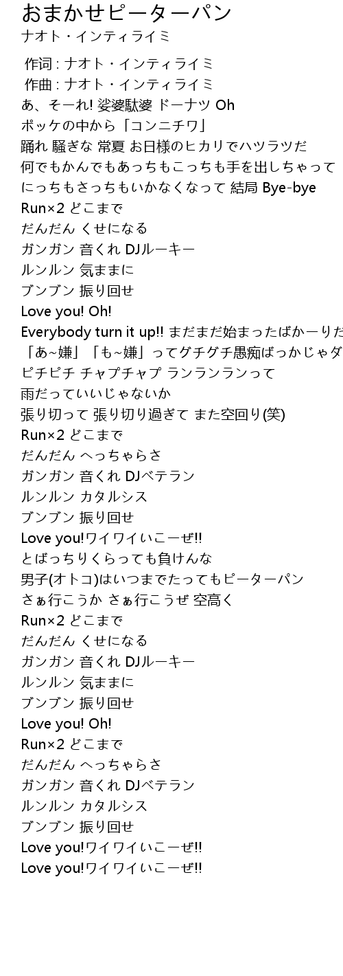 | [01:30.19] | とばっちりくらっても負けんな 男子(オトコ)はいつまでたってもピーターパン |