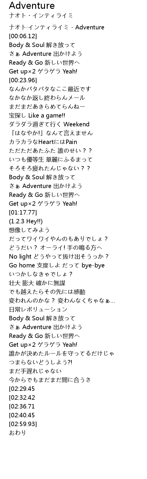 | [00:00.00] | ナオト·インティライミ - Adventure |