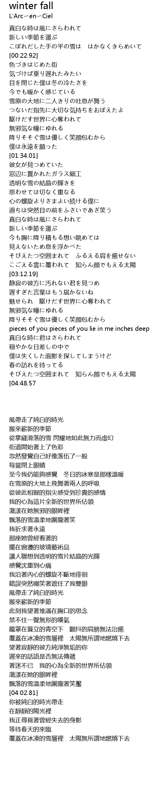 | [00:55.58] | 雪原の大地に二人きりの吐息が舞う |