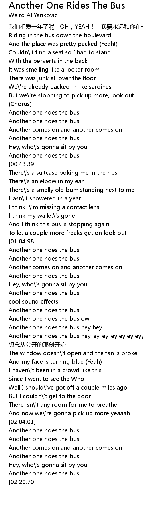 | [01:40.19] | Another one rides the bus heyeyeyey ey ey eyyyyyy |