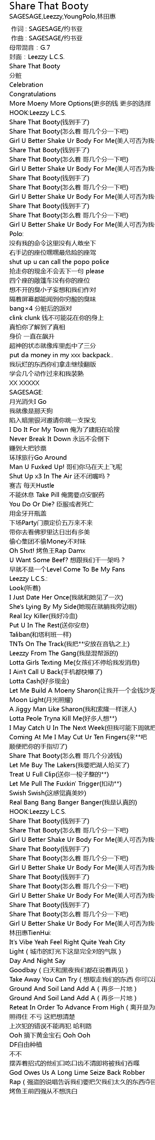 | [00:15.460] | Share That Booty zěn me zhāo gē jǐ gè fēn yī xià ba |