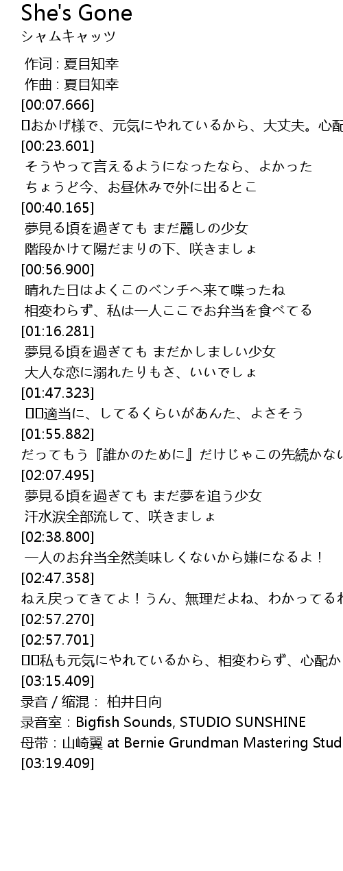 | [03:17.409] | lu yin shi: Bigfish Sounds, STUDIO SUNSHINE |