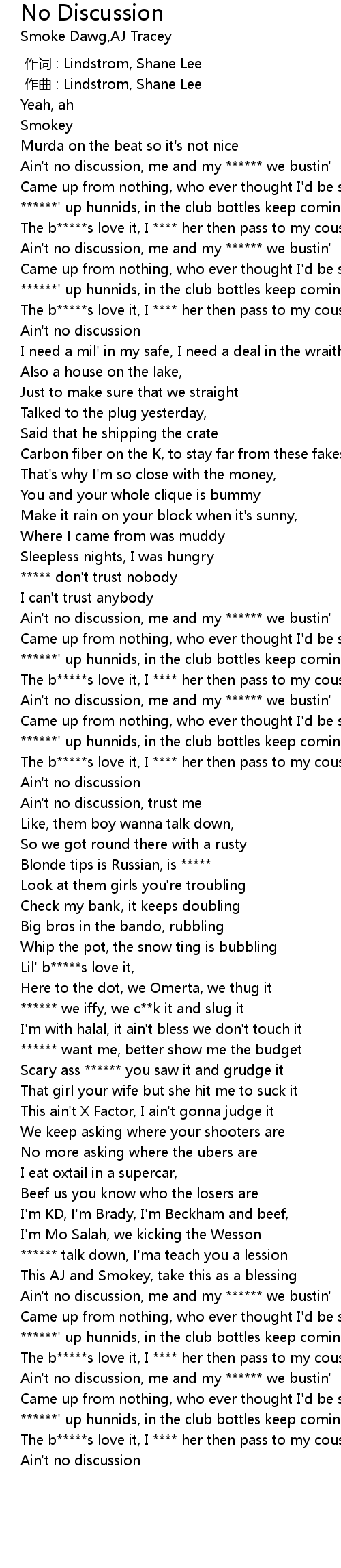 | [02:20.00] | Ain't no discussion, me and my ****** we bustin' |
