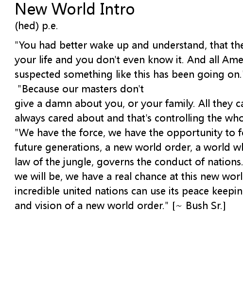"You had better wake up and understand, that there are people who are guiding your life and you don't even know it. And all American citizens I think, have suspected something like this has been going on." [~ Matrix of Power: Jordan Maxwell 1992 - Freemasonry Connections to Illuminate] "Because our masters don't give a damn about you, or your family. All they care about is what they have always cared about and that's controlling the whole damn world." [~ Zeitgeist] "We have the force, we have the opportunity to forge, for our selves and for future generations, a new world order, a world where the rule of law, not the law of the jungle, governs the conduct of nations. When we are successful, and we will be, we have a real chance at this new world order, an order in which incredible united nations can use its peace keeping role to fulfill the promise and vision of a new world order." [~ Bush Sr.] |