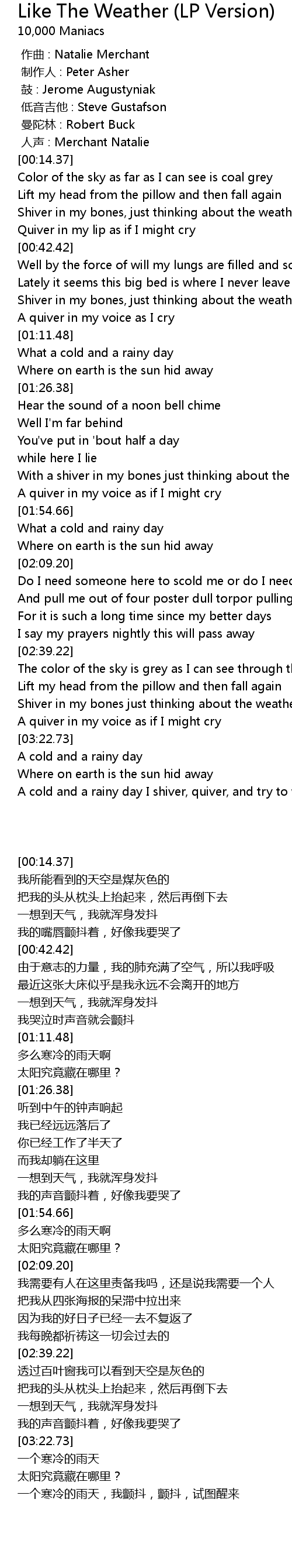 | [00:28.54] | Shiver in my bones, just thinking about the weather |