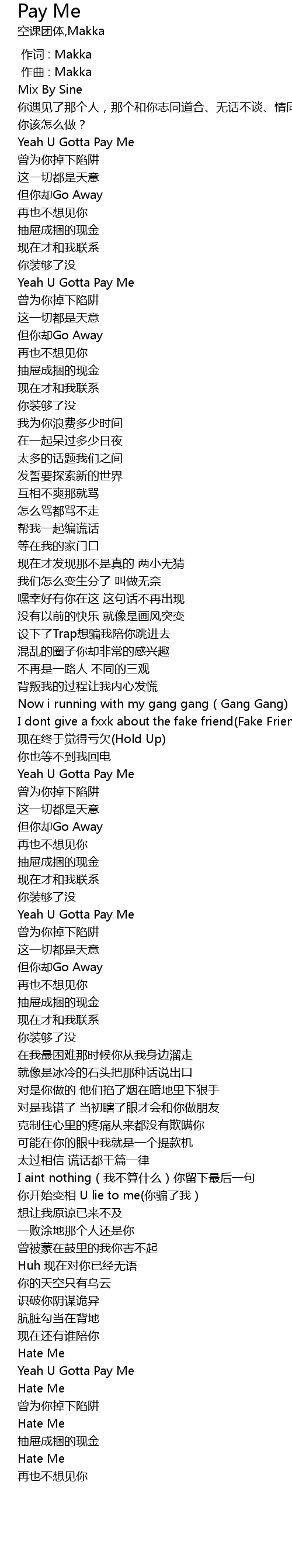 | [00:49.776] | Yeah U Gotta Pay Me |