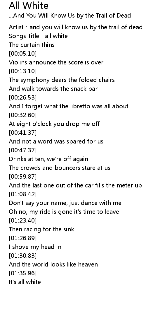| [00:00.34] | Artist: and you will know us by the trail of dead |