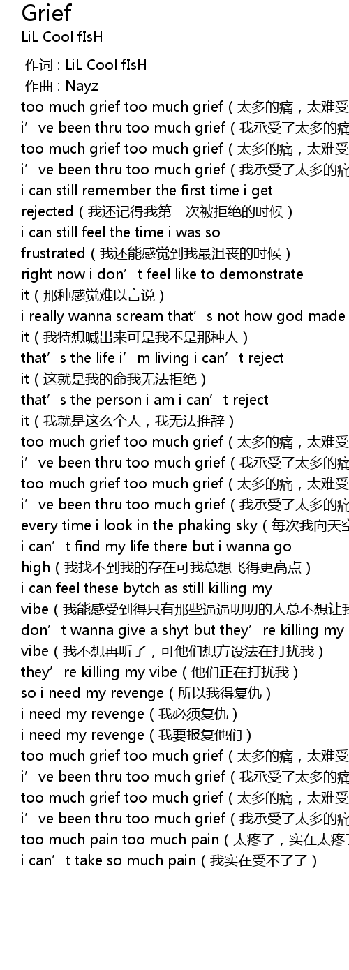 | [00:41.264] | too much grief too much grief(太多的痛,太难受了) |