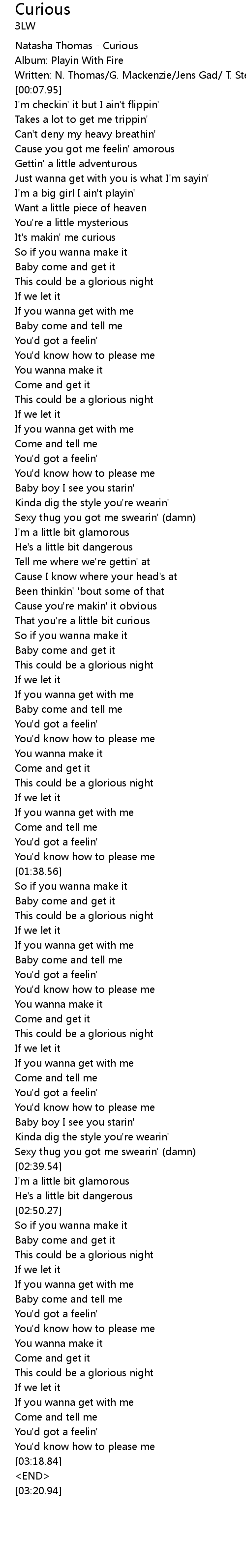 | [00:03.89] | Written: N. Thomas/G. Mackenzie/Jens Gad/ T. Stenezl/Rap: Triple C |