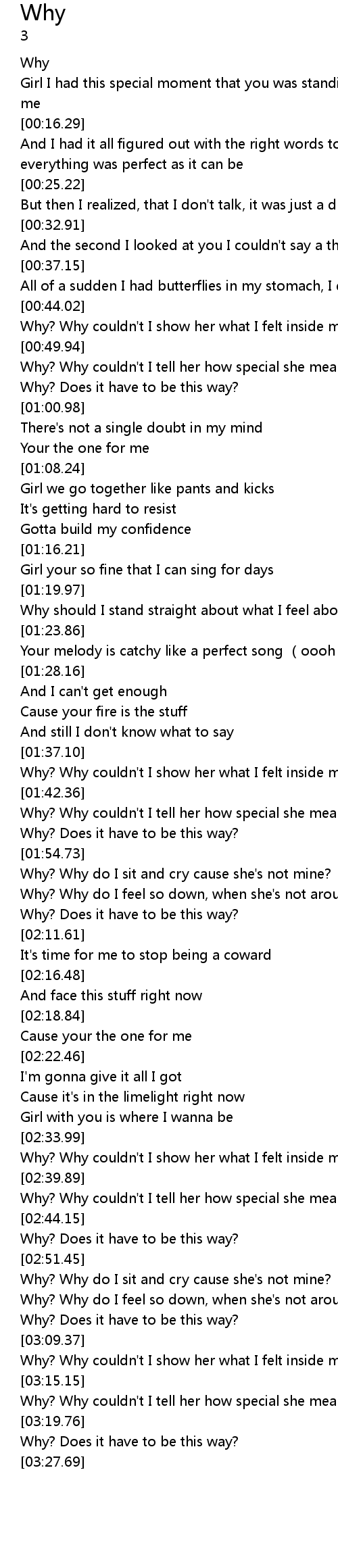 | [02:52.95] | Why? Why do I sit and cry cause she's not mine? |