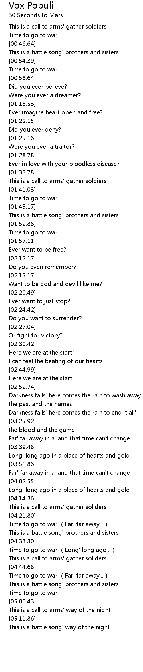 | [00:38.20] | This is a call to arms' gather soldiers |