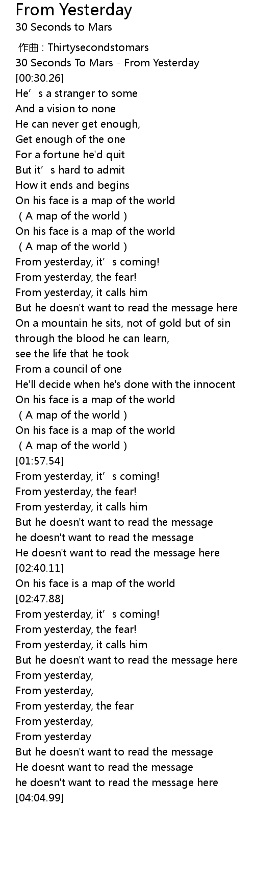 | [00:00.00] | 30 Seconds To Mars From Yesterday |