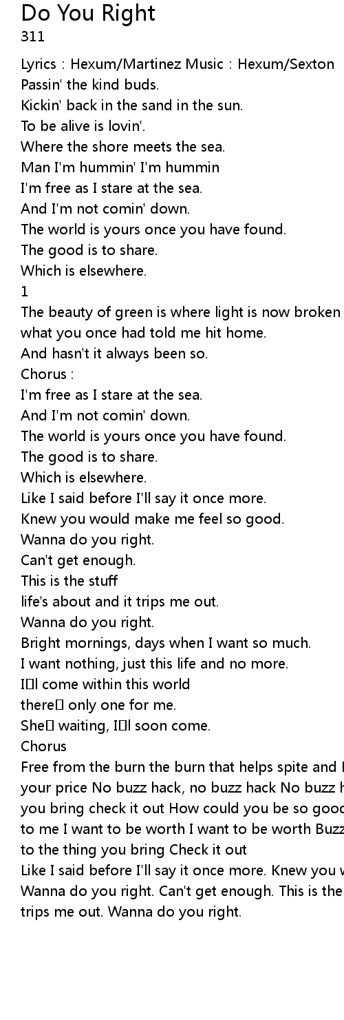 | Like I said before I' ll say it once more. Knew you would make me feel so good. Wanna do you right. Can' t get enough. This is the stuff life' s about and it trips me out. Wanna do you right. |