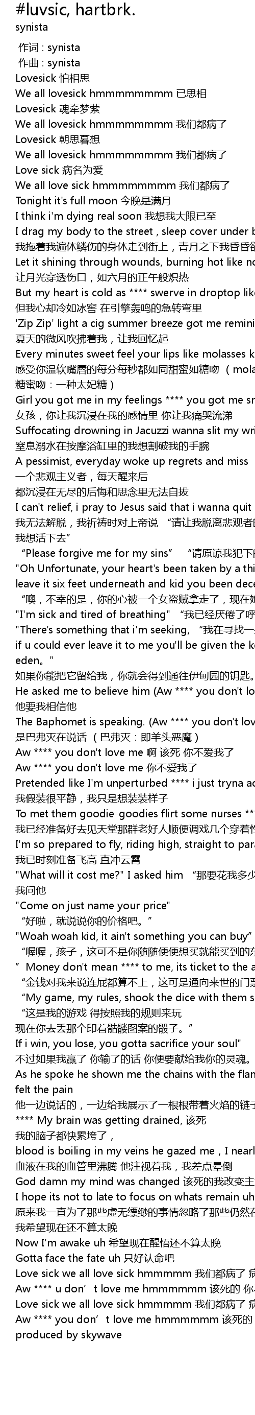 | [00:40.973] | Suffocating drowning in Jacuzzi wanna slit my wrist 窒息溺水在按摩浴缸里的我想割破我的手腕 |