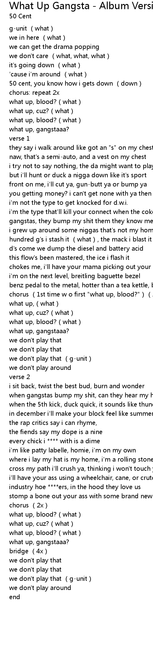 | 歌曲 | What Up Gangsta - Album Version (Explicit) |