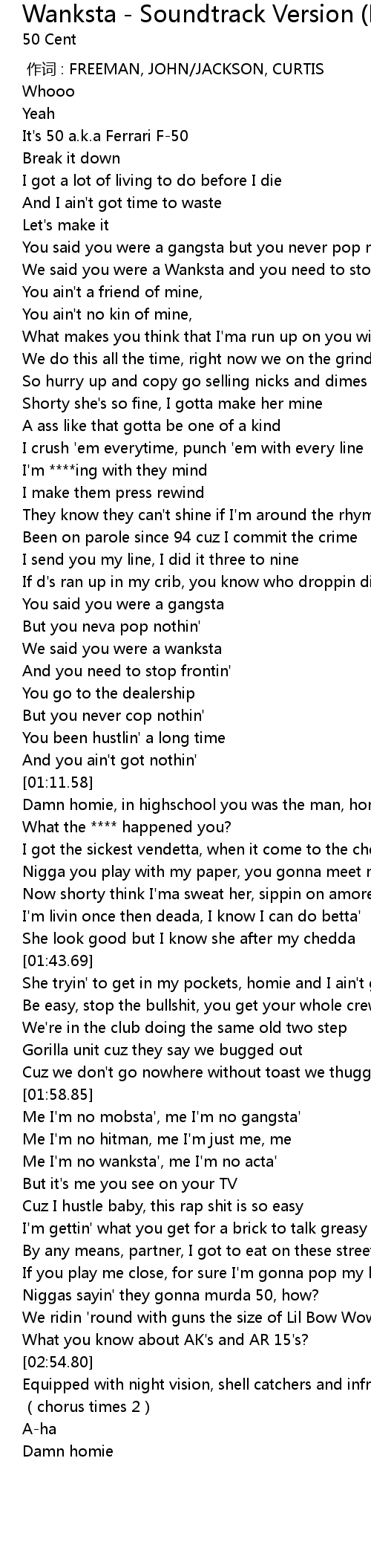 | [00:21.28] | We said you were a Wanksta and you need to stop frontin' |