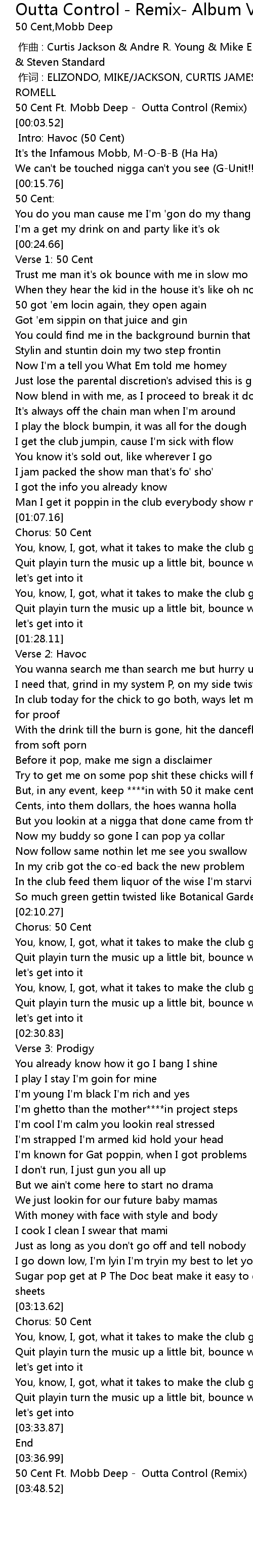 | [00:00.52] | 50 Cent Ft. Mobb Deep - Outta Control (Remix) |