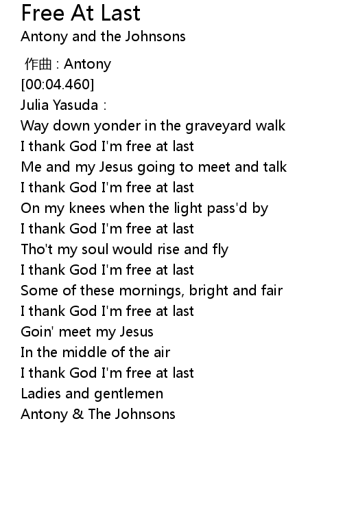 | [00:20.540] | I thank God I' m free at last |