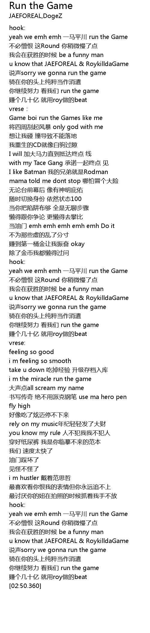 | [02:27.839] | yeah we emh emh 一马平川 run the Game |