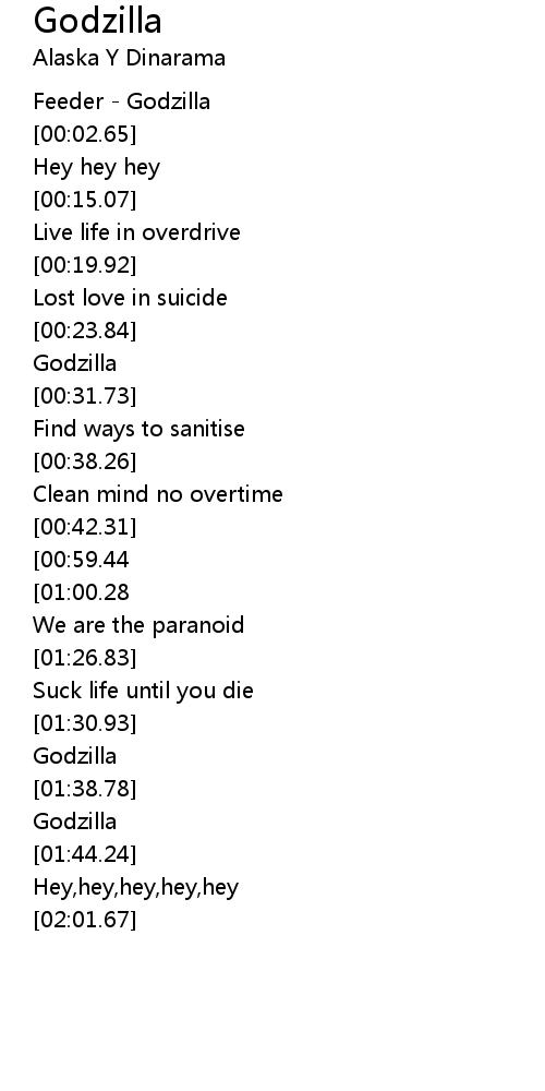 | [01:19.22][00:59.44][00:49.38] | Godzilla |