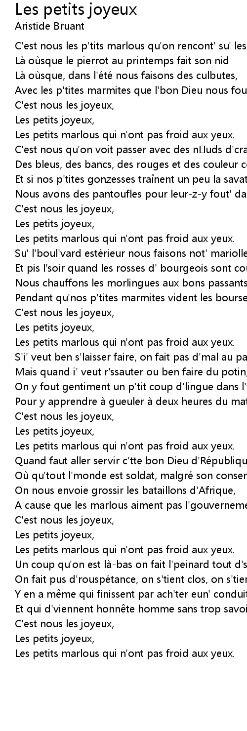| C' est nous les p' tits marlous qu' on rencont' su' les buttes, | |