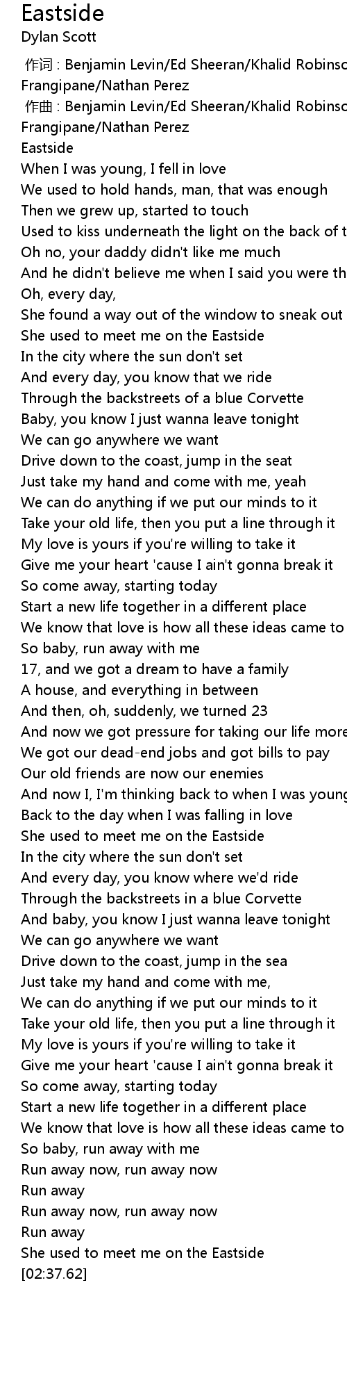 | [00:01.000] | zuo qu : Benjamin Levin Ed Sheeran Khalid Robinson Ashley Frangipane Nathan Perez |
