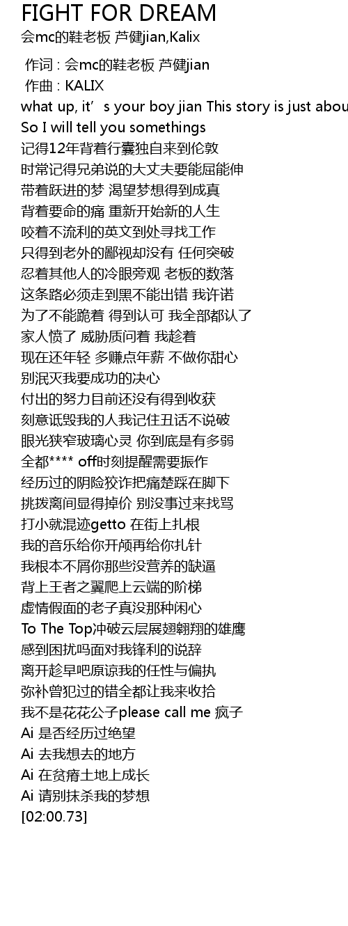 | [00:00.000] | 作词 : 会mc的鞋老板 芦健jian |