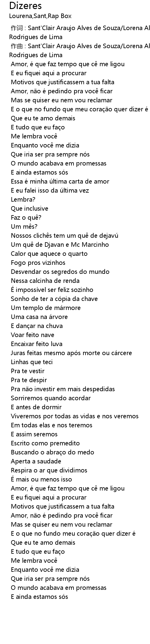 | [00:00.000] | 作词 : Sant'Clair Araujo Alves de Souza/Lorena Almeida Alves Rodrigues de Lima |