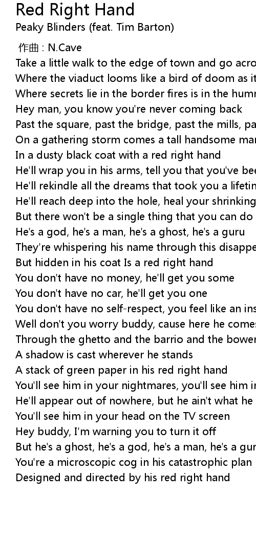 | [01:43.600] | But hidden in his coat Is a red right hand |