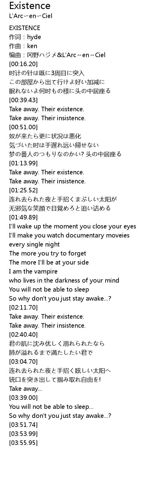 | [00:14.20] | 编曲:冈野ハジメ&L'Arc~en~Ciel |
