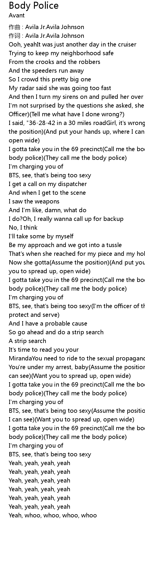 | I gotta take you in the 69 precinct(Call me the body police)(They call me the body police)(They call me the body police) | |