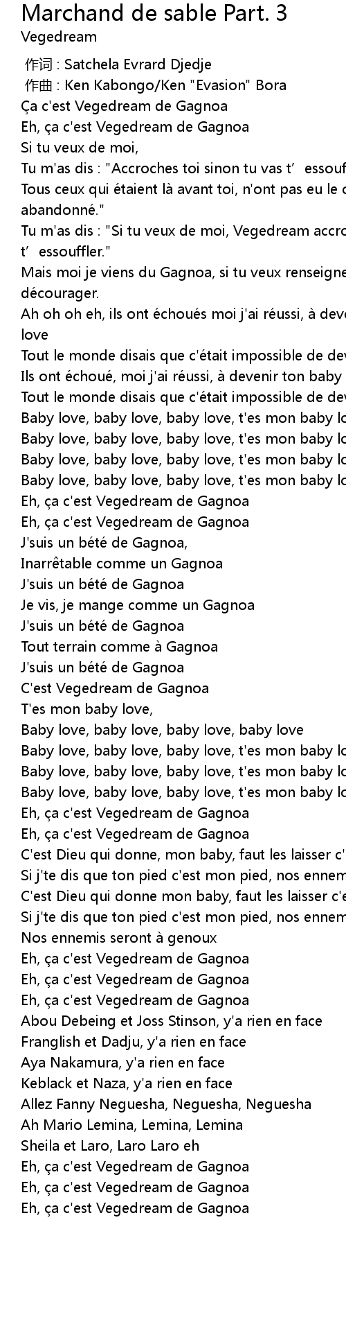 | [00:17.15] | Tu m' as dis : " Si tu veux de moi, Vegedream accroches toi sinon tu vas t' essouffler." |