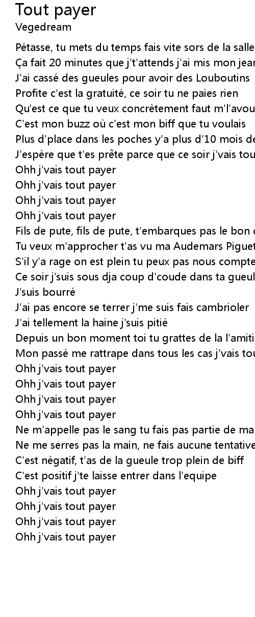 | [00:40.65] | J' espè re que t' es pr te parce que ce soir j' vais tout payer |