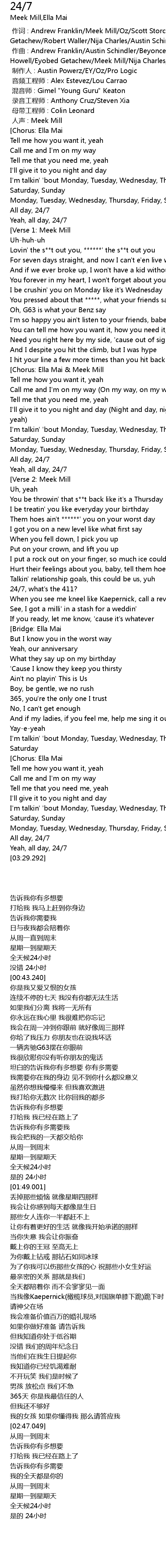 | [00:00.373] | 作曲 : Andrew Franklin/Austin Schindler/Beyonce Knowles/Ella Howell/Eyobed Getachew/Meek Mill/Nija Charles/OZ/Robert Waller/Scott Storch |