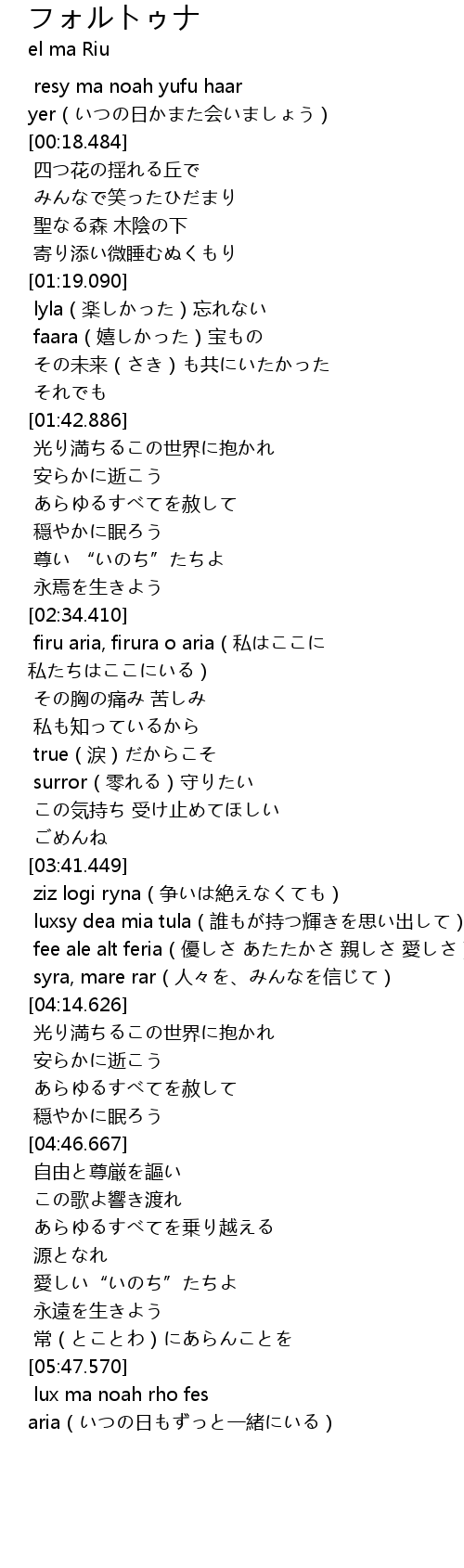 | [02:38.314] | firu aria, firura o aria(私はここに 私たちはここにいる) |