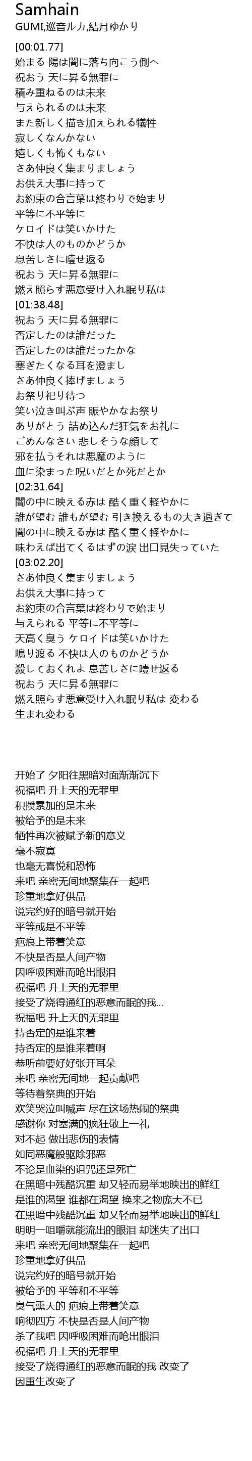 | [01:38.79] | 祝おう 天に昇る無罪に |