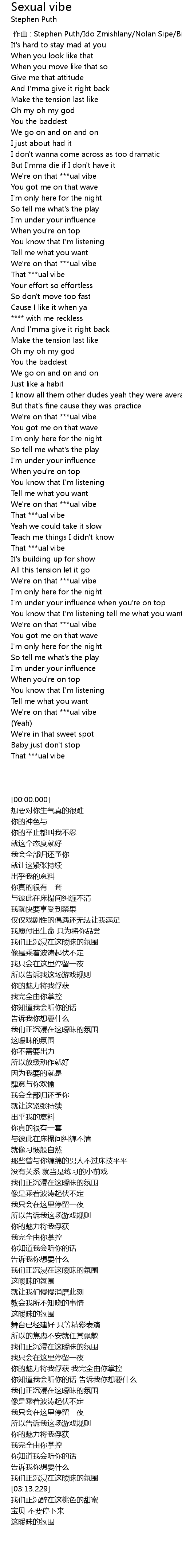 | [00:00.000] | zuo qu : Stephen Puth Ido Zmishlany Nolan Sipe Brian Lee |
