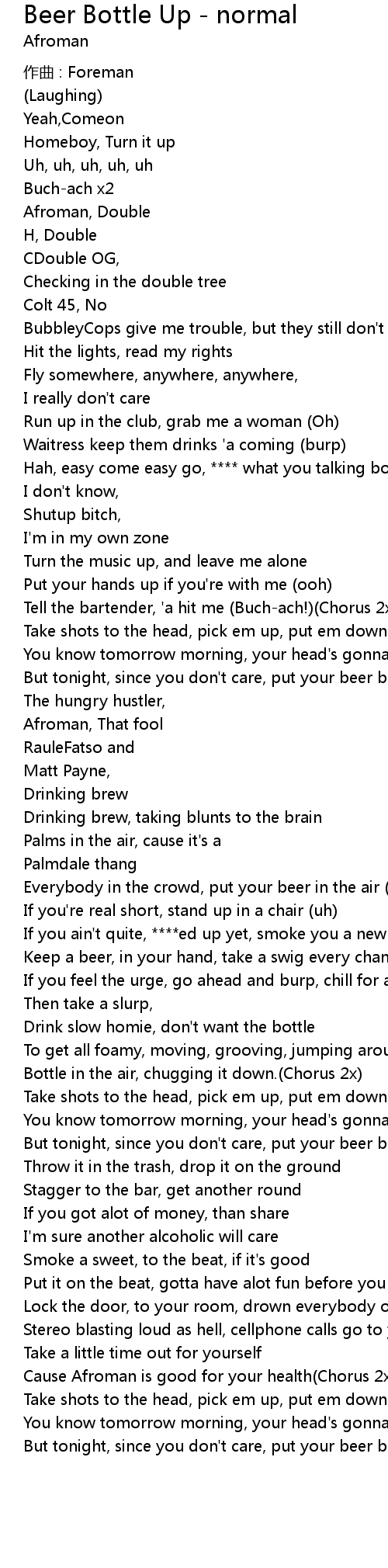 | But tonight, since you don' t care, put your beer bottle in the air Chorus 2x |
