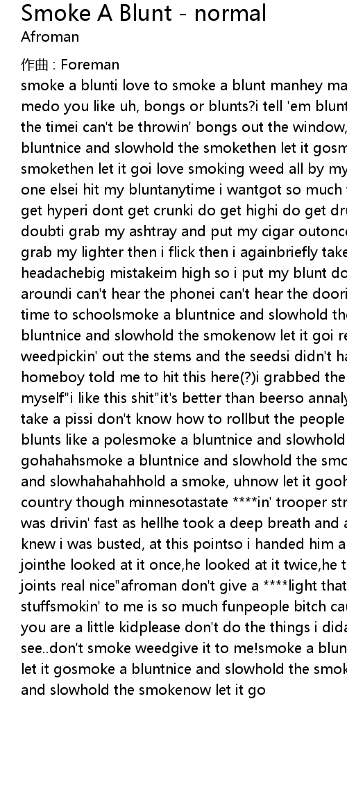 | smoke a blunti love to smoke a blunt manhey man you know, my white homies ask medo you like uh, bongs or blunts? i tell ' em blunts, cause i get pulled over all the timei can' t be throwin' bongs out the window, you know what i meansmoke a bluntnice and slowhold the smokethen let it gosmoke a bluntnice and slowhold the smokethen let it goi love smoking weed all by myselfdont have to pass it to no one elsei hit my bluntanytime i wantgot so much weed i dont have to hunti dont get hyperi dont get crunki do get highi do get drunkonce im high and im high no doubti grab my ashtray and put my cigar outonce my high is gone with the windi grab my lighter then i flick then i againbriefly take a chronic breakweed headachebig mistakeim high so i put my blunt downturn up my music and dance all aroundi can' t hear the phonei can' t hear the doori never leave home ' lessits time to schoolsmoke a bluntnice and slowhold the smokenow let it gosmoke a bluntnice and slowhold the smokenow let it goi remember when i started smokin weedpickin' out the stems and the seedsi didn' t have enough to buy me a beermy homeboy told me to hit this here? i grabbed the blunti took a hiti thought to myself" i like this shit" it' s better than beerso annalyze thisi don' t have to go take a pissi don' t know how to rollbut the people i roll withknow how to roll blunts like a polesmoke a bluntnice and slowhold the smokenow let it gohahahsmoke a bluntnice and slowhold the smokenow let it gosmoke a bluntnice and slowhahahahhold a smoke, uhnow let it goohahahah uhh haha uhhdrivin' cross country though minnesotastate in' trooper straight pulled me overhe said i was drivin' fast as hellhe took a deep breath and asked " what' s that smell?" i knew i was busted, at this pointso i handed him a beautiful, perfectly rolled jointhe looked at it once, he looked at it twice, he told me, " you roll your joints real nice" afroman don' t give a light that blunt and get stupid stuffsmokin' to me is so much funpeople bitch cause i don' t get nothin' doneif you are a little kidplease don' t do the things i didantidrug message? let me see.. don' t smoke weedgive it to me! smoke a bluntnice and slowhold the smokenow let it gosmoke a bluntnice and slowhold the smokenow let it gosmoke a bluntnice and slowhold the smokenow let it go |